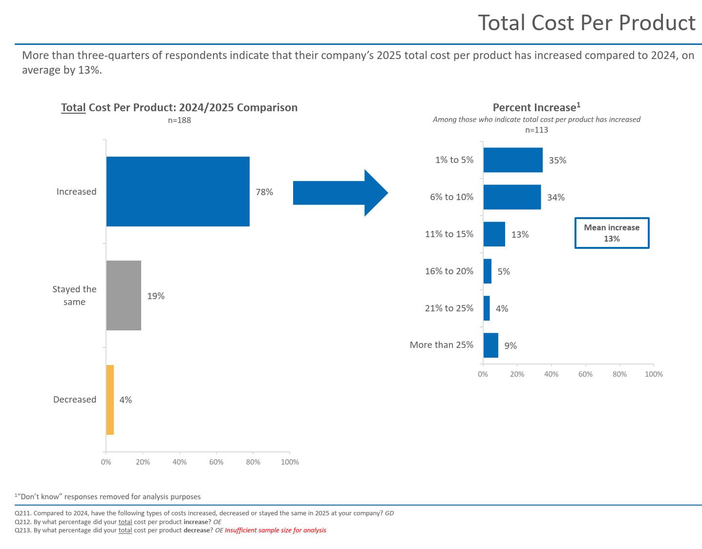 Nearly 70% of this year’s survey respondents say their company’s total cost per product has increased up to 10%, while 13% say costs have jumped between 11% and 15%. The mean increase is 13%.