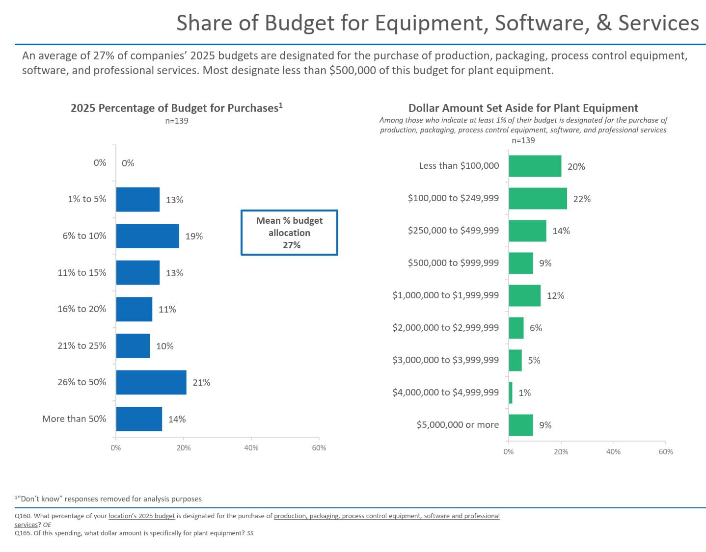 Some manufacturers say their budgets for production, packaging and process control equipment, as well as professional services, have increased this year. Specifically, 54% of survey respondents expect an increase, while 34% say their budgets will stay the same. Last year, exactly half (50%) expected an increase and 40% expected their budgets to remain the same.