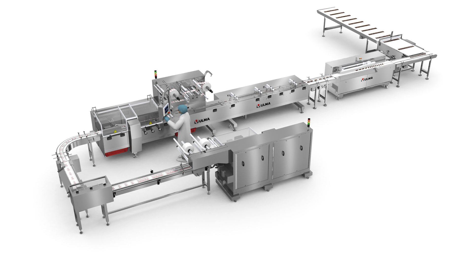 A complete bar packaging line includes primary packaging and secondary packing equipment plus equipment to line the bars up in correct position for packaging. Photo courtesy of Harpak-ULMA