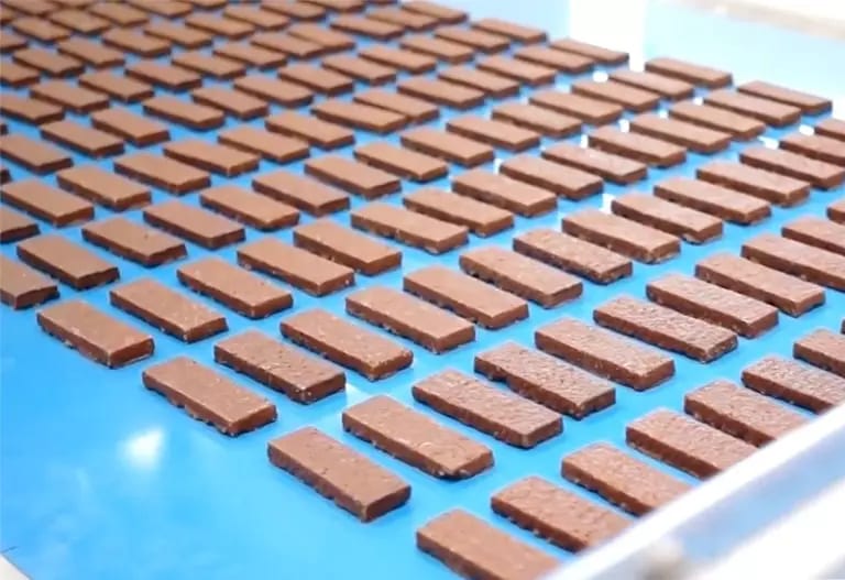 Bars are lined up for automatic feeding into a conveyor system leading to packaging in a pouch. Photo courtesy of Harpak-ULMA